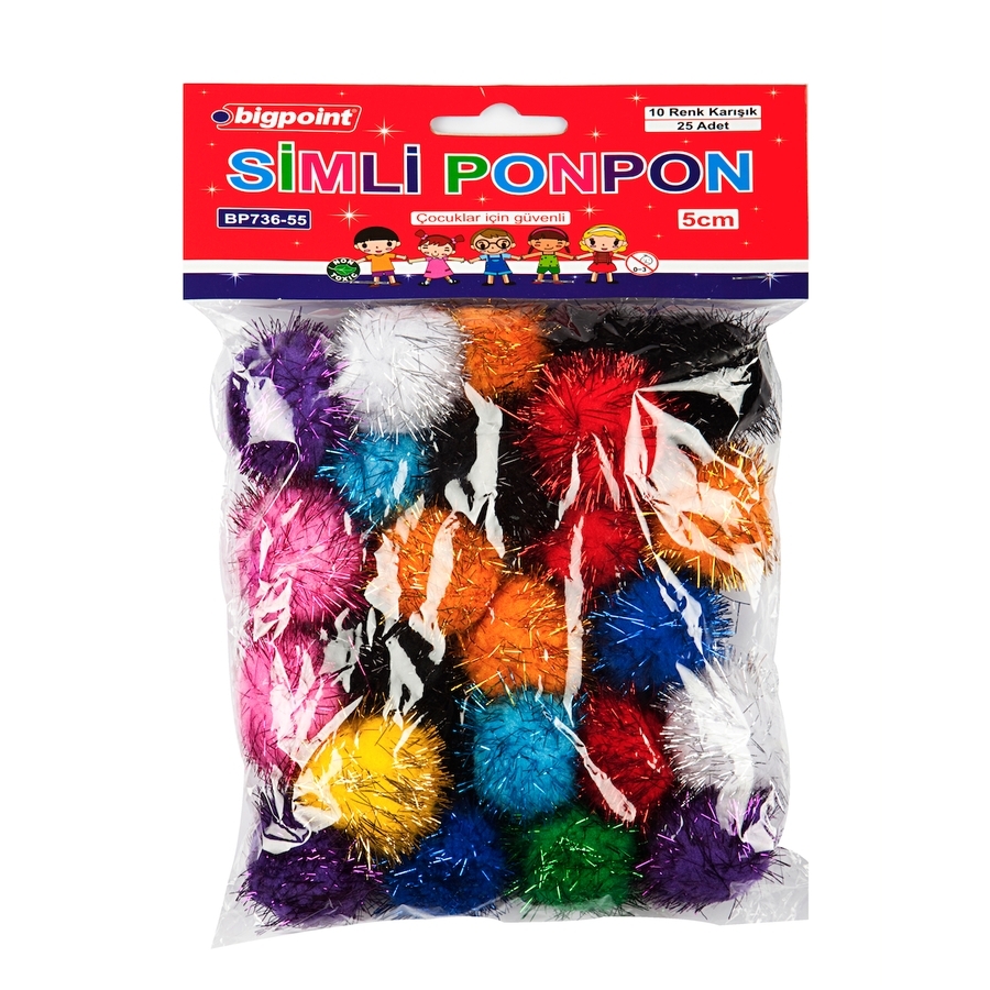 Paketinde 5 cm çapında 10 farklı renkte 25 adet simli ponponPonpon üstündeki simler dökülmez, yünleri elinize bulaşmaz ve elişi derslerine uygundur.