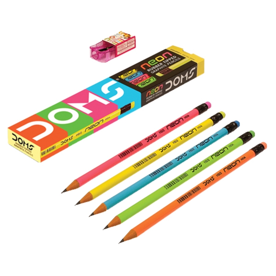 Kutu içerisinde 12 adet Doms Neon kurşun kalem ve kalemtraş. Gövde renginde kalem arkasındaki dust-free silgisi sayesinde kolay kullanım. HB dereceli kurşun kalem orta yumuşaklıkta yazar, silince iz bırakmaz.Ağaç cidarlı altıgen gövdelidir.