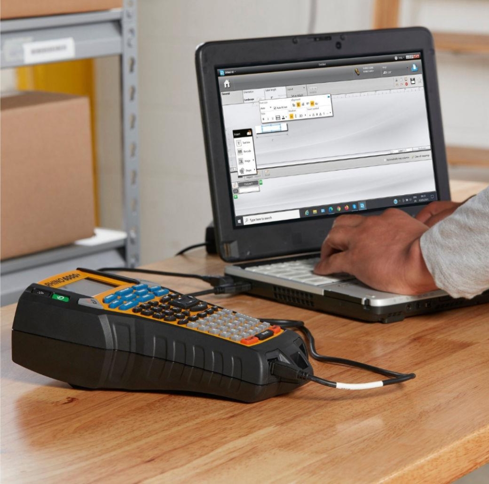 - PC'de DYMO® ID™ yazılımından* barkodlar ve karmaşık etiket düzenleri içeren etiketler oluşturun ve kolay düzenleme için Rhino™ 6000+ ile yazdırın
