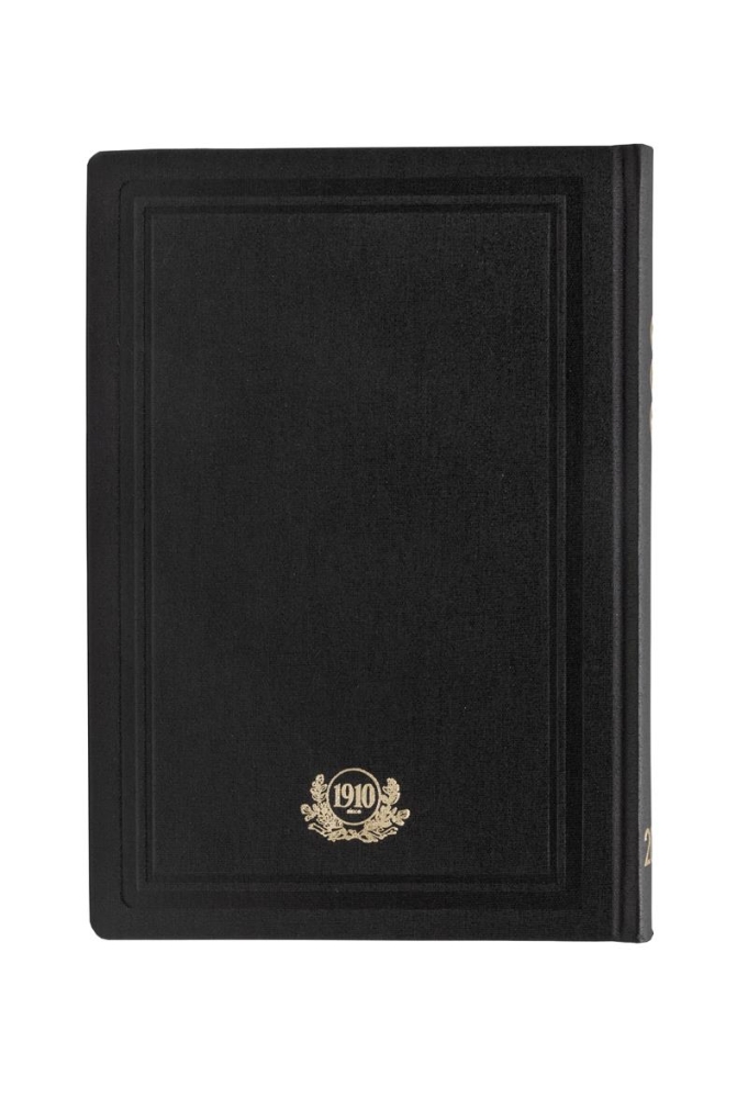 Ece klasiği, siyah özel cilt bezi üstüne gofre ve yaldız baskılı kapak. Ciltli, kurdele ayraçlı, her sayfada bir günlük ticari, çizgili ajanda.