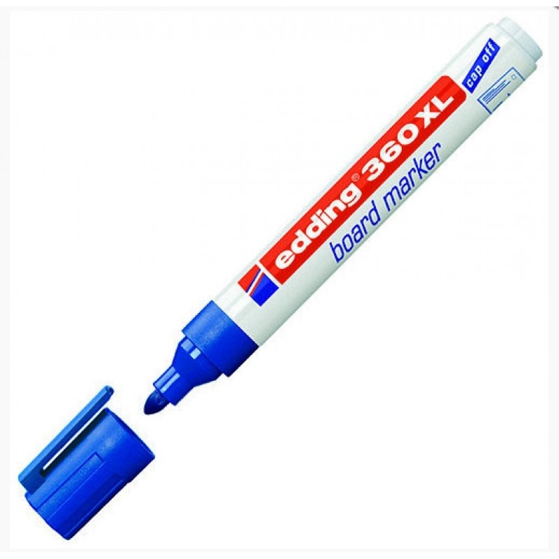 Edding 360 XL Beyaz Yazı Tahtası Kalemi, mavi renk seçeneği ile en fazla kullanılan renklerden biridir. Sınıf, ofis ve sunumlarda yazı tahtası kalemi ihtiyaçlarında, profesyonel yazım kalitesi ile ideal bir üründür. Doldurulabilir özelliğe sahip olan Edding 360 XL Beyaz Yazı Tahtası Kalemi yazma ve silme performansında üst düzey kalite taahhüt eder. Beyaz Yazı Tahtası üzerine yazı yazmak ve işaretleme yapmak için geliştirilen ürün emaye, melamin ve cam gibi pürüzsüz yüzeylerde de uygulanabilmekte, ve tüm bu pürüzsüz yüzeylerden kuru bir bez yardımıyla kolayca silinebilmektedir. Cap-off mürekkep teknolojisi sayesinde, kalemin kapağı açık olsa bile mürekkep kurumadan birkaç gün kalabilir. Hızlı kuruma gerçekleştiren mürekkep yapısı ışığa da dayanıklılık içermektedir. Yuvarlak uca sahip olan Edding 360 XL, 1,5 mm ile 3 mm arasında çizgi genişliği imkanı sunmaktadır. Muadillerine göre daha hafif koku içermekle birlikte, butil asetat katkısı içermeyen Edding 360 XL Beyaz Yazı Tahtası Kalemi ekolojik açıdan ve sağlık açısından kullanıma uygun bir kalemdir.- Yuvarlak uç 1,5 - 3mm uç kalınlığı