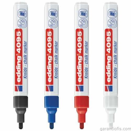 Edding 4095 Koyu renkli panolar, kara tahtalar, camlar ve pencereler gibi birçok gözeneksiz yüzeylerde yazı yazmak ve şekil çizmek için geliştirilmiştir. Işığa karşı dayanıklıdır ve kolaylıkla nemli veya kuru bir bez yardımı ile silinebilir.
