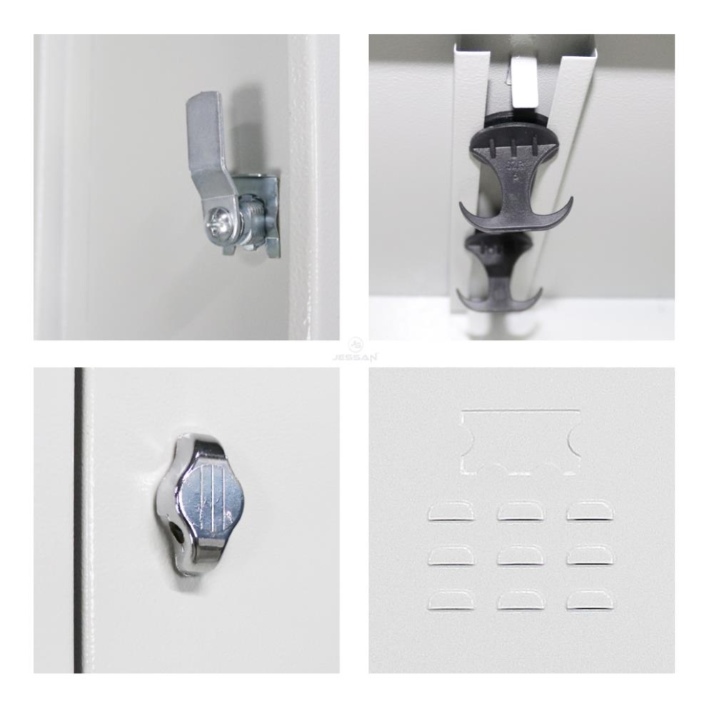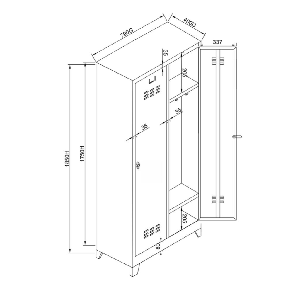 Sağlam punta kaynaklı DKP sac yapımıdır. 2 kapılı soyunma dolabı. Her bölümün üst tarafında birer adet raf bulunmakta ve rafın altında askılık bulunmaktadır.