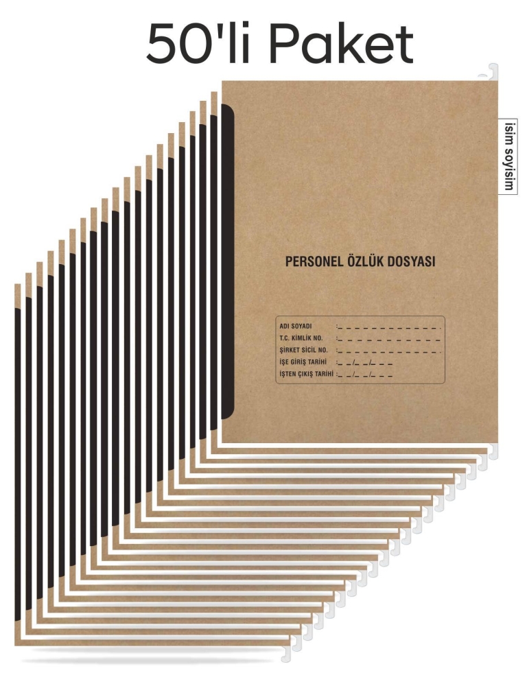 Askılı personel özlük dosyası 8 yapraklıdır, tamamı kraft karton malzemeden üretilmiştir, demir askıya sahip olduğu için tüm askılı dosya dolaplarına ve askılı dosya havuzlarına uyumludur. Üst kısımda isimlik mevcuttur.