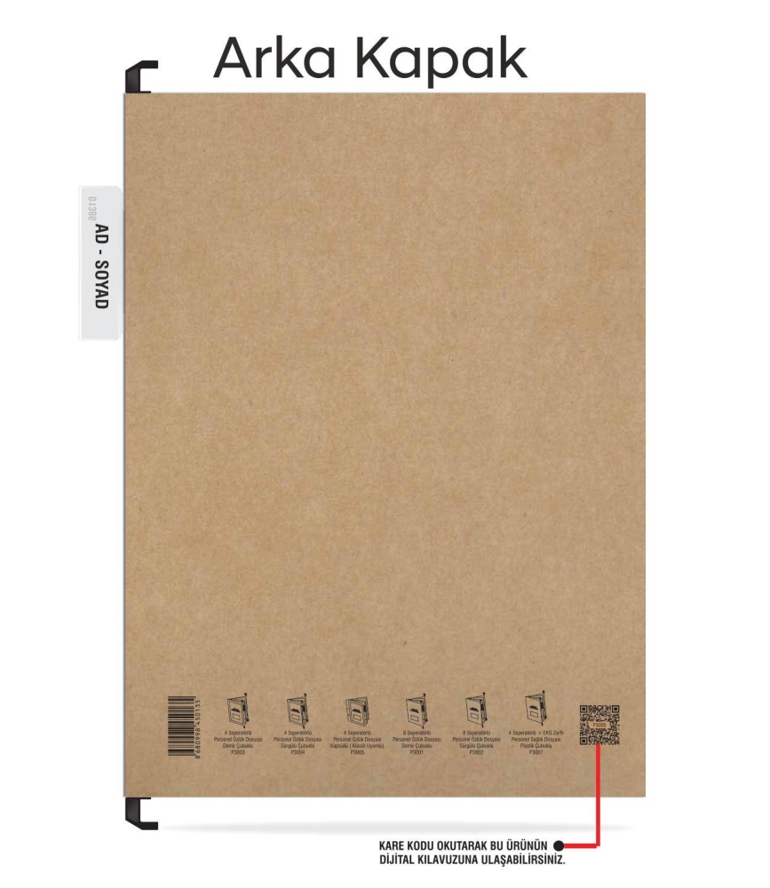 Askılı personel özlük dosyası Tek yapraklıdır, tamamı kraft karton malzemeden üretilmiştir, Plastik askıya sahip olduğu için tüm askılı dosya dolaplarına ve askılı dosya havuzlarına uyumludur. Üst kısımda isimlik mevcuttur.