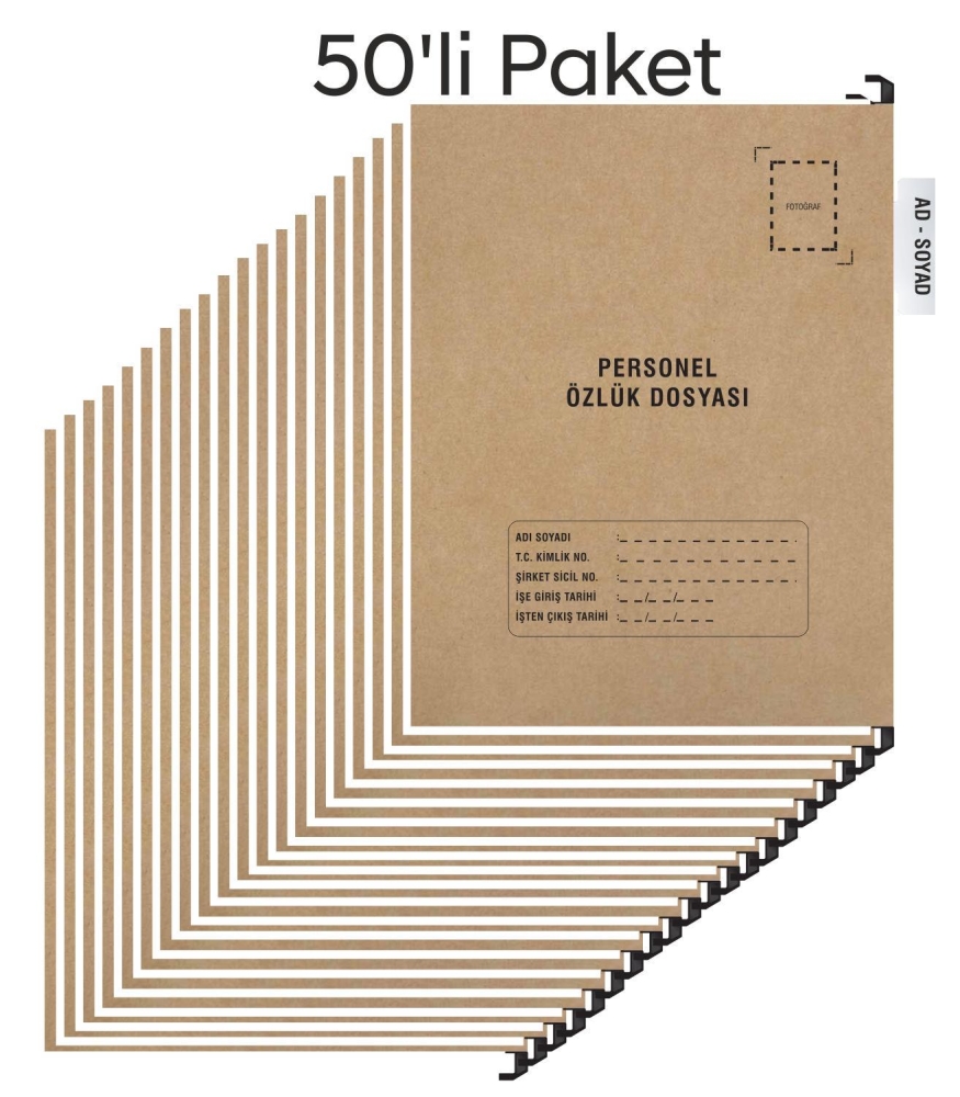 Askılı personel özlük dosyası Tek yapraklıdır, tamamı kraft karton malzemeden üretilmiştir, Plastik askıya sahip olduğu için tüm askılı dosya dolaplarına ve askılı dosya havuzlarına uyumludur. Üst kısımda isimlik mevcuttur.