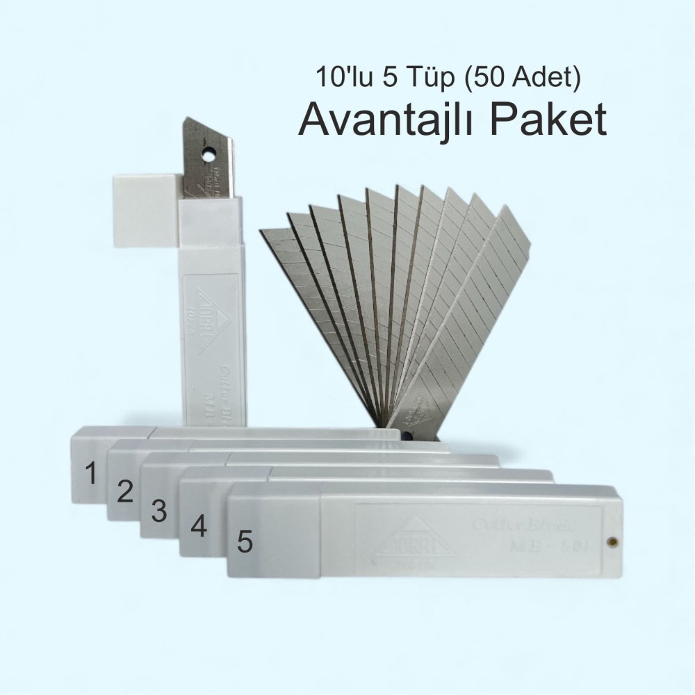 1 tüp içinde 10 adet Toplamda 50 Adet Zorro maket bıçağı yedeği bulunur.