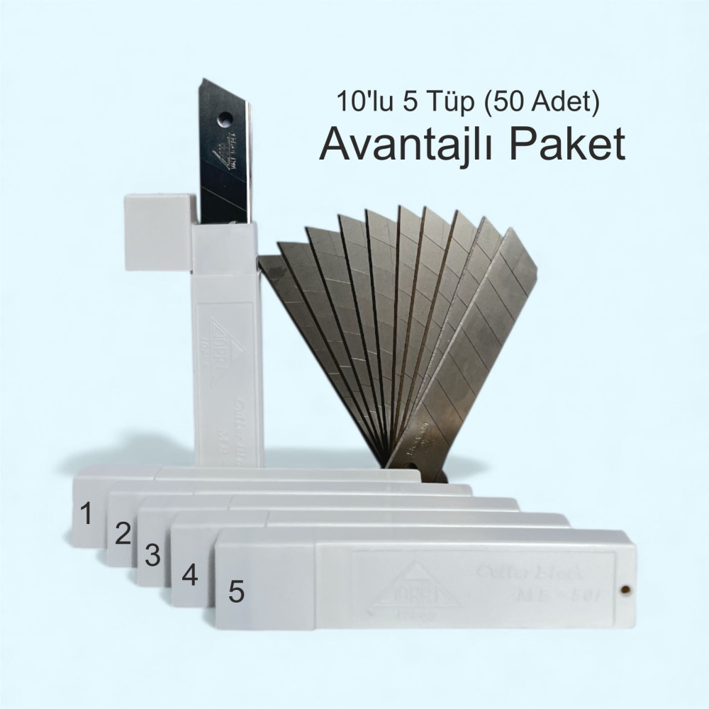 1 tüp içinde 10 adet Toplamda 50 Adet Zorro maket bıçağı yedeği bulunur.